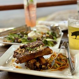 Located in Kaimuki, the Surfing Pig is a two story restaurant full of smoky drinks and meats! My friends and I enjoyed a great meal here. Service was excellent and all the staff was so friendly! We were seated upstairs and ordered everything family style. We started with cocktails. They have a few smoky drinks that are served covered in a lid that is lifted upon delivery and all the smoke pours out. They had great flavor and were so fun! For food, we ordered the ribs and a whole bunch of sides. The meat was tender and juicy. The truffle fries were a must and perfectly thin and crispy. I also really loved the buttery corn. The mashed potatoes were a little dry so they weren't quite my favorite. The mac n cheese was a very different style. It was very cheesy and thick. Tasty! We ended the meal with some dessert. I loved the lava cake. It was so decadent and delicious.